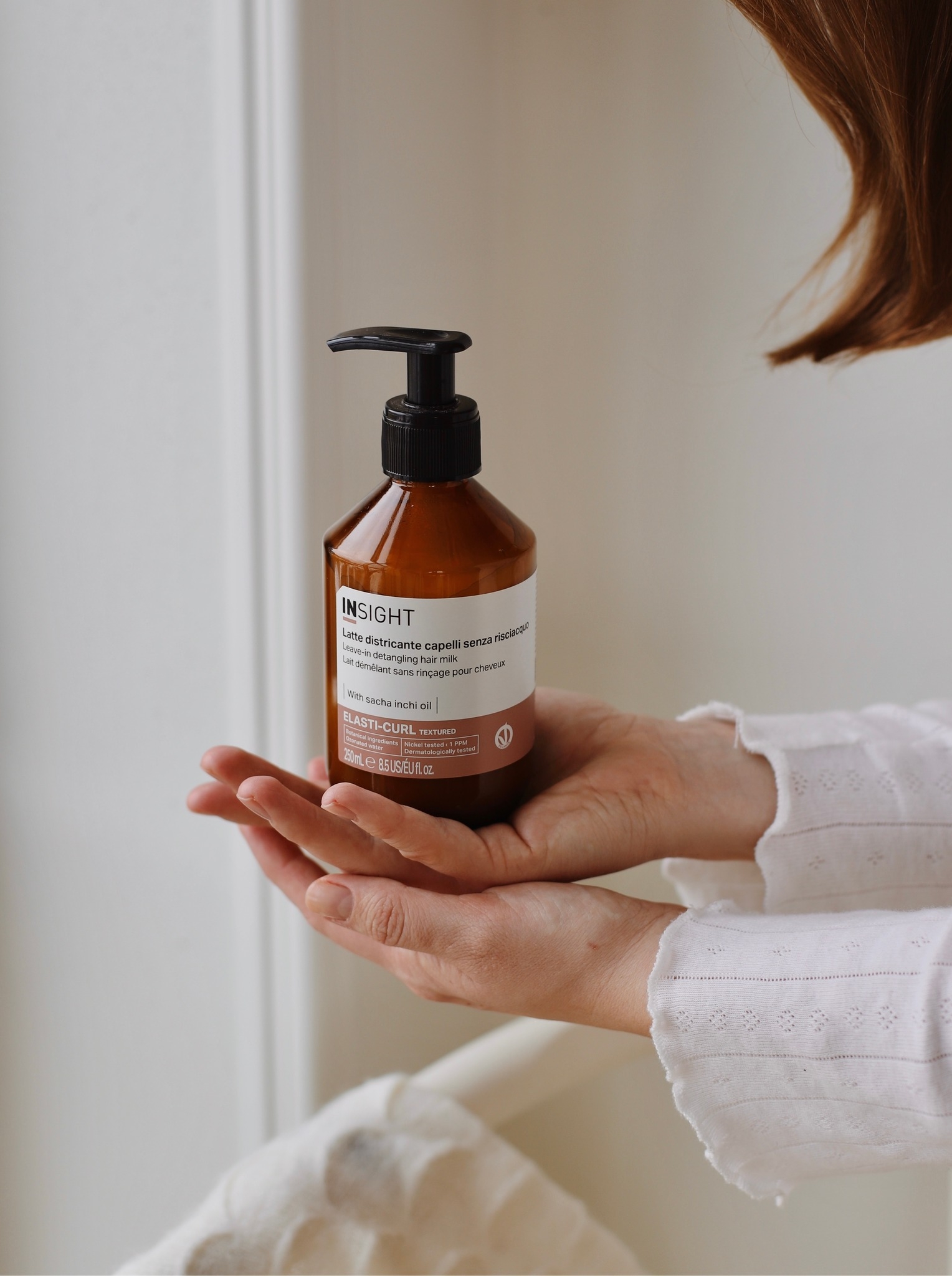 INSIGHT ELASTI-CURL LEAVE-IN DETANGLING HAIR MILK – Mleczko ułatwiające rozczesywanie bez spłukiwania do włosów kręconych 250 ML Mleczko do rozczesywania o formule lekkiego fluidu do codziennej pielęgnacji włosów kręconych i falowanych. Ułatwia rozczesywanie, działa kondycjonująco i upiększająco. Dzięki niemu Twoje włosy będą lekkie, sprężyste i bardziej odporne na puszenie. Bazuje na kompozycji trzech olejków roślinnych: kokosowego, z nasion chia i sacha inchi. Takie połączenie to sposób na odżywienie głębokich warstwa łodygi i wygładzenie jej otoczki, aby fryzura była elastyczna i pełna naturalnego blasku.   Dlaczego go pokochasz? Dzięki niemu bez trudu rozczeszesz nawet szorstkie i plączące się kosmyki Mleczko zapewnia zastrzyk składników odżywczych i wzmacniających Sprawia, że włosy są bardziej zdyscyplinowane i podatne na układanie Dodaje fryzurze blasku, lekkości i chroni ją przed puszeniem z powodu wzrostu wilgotności powietrza   Polecany dla włosów: Odpowiednie dla włosów kręconych i falowanych każdego typu.   Wyjątkowe składniki: Organiczny olej kokosowy – odżywia i regeneruje delikatną strukturę włosów kręconych i falowanych. Dzięki zawartości witaminy E pomaga zapobiegać ich osłabieniu i przyspieszonemu starzeniu pod wpływem szkodliwych czynników zewnętrznych. Olej z nasion chia – sprawia, że szorstkie i plączące się włosy stają się gładsze i bardziej miękkie. Zawarte w nim kwasy omega 3 i 6 intensywnie odżywiają kosmyki. Olej sacha inchi – wygładza porowatą strukturę włosa, tym samym ograniczając odparowywanie naturalnej wilgoci i zmniejszając jego tendencję do puszenia. Poprawia elastyczność i wydobywa blask fryzury.   Sposób użycia: Rozprowadź niewielką porcję mleczka na włosach i przystąp do układania fryzury.