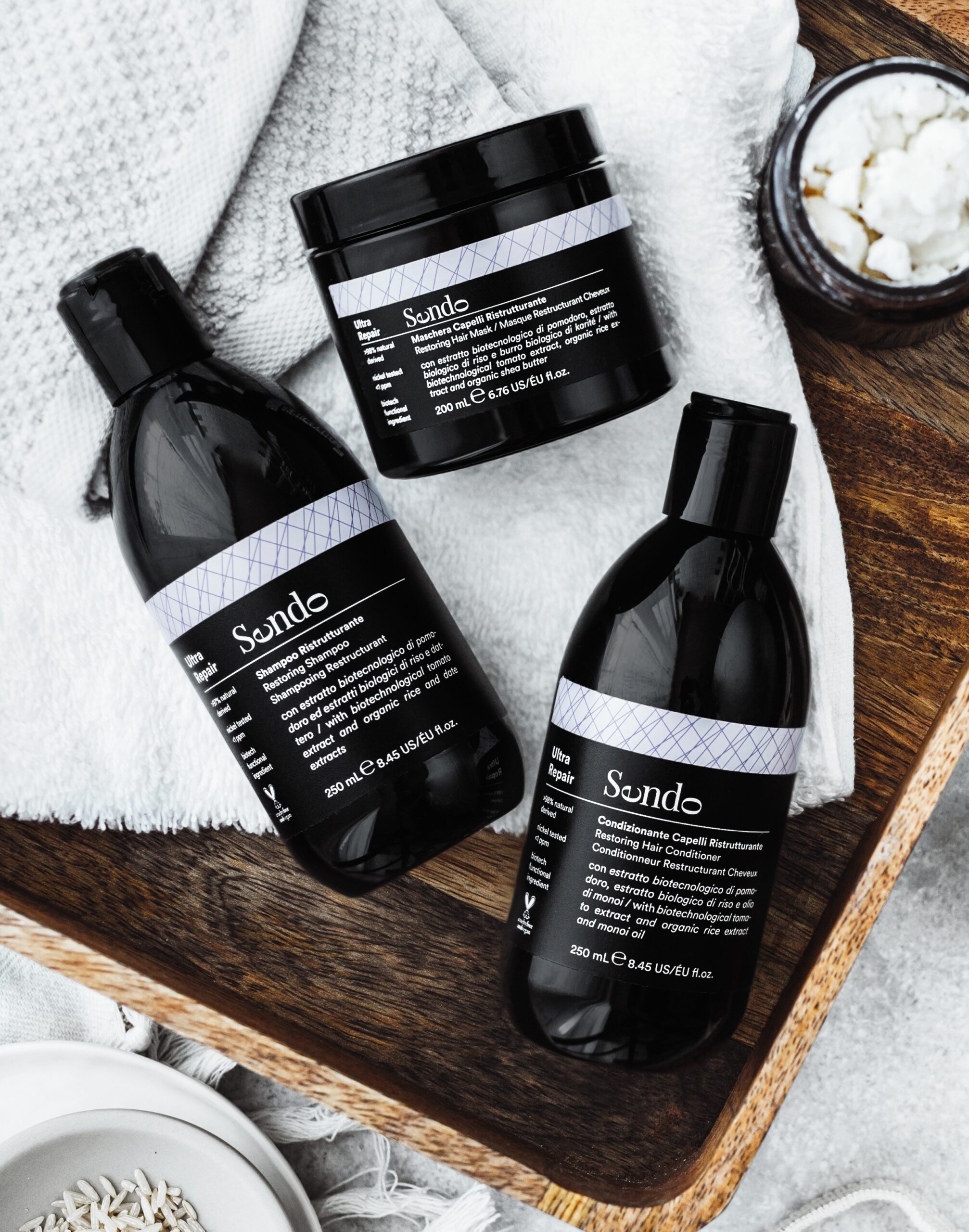 Sendo Ultra Repair to trzyetapowy rytuał odbudowujący, stworzony z myślą o włosach zniszczonych, osłabionych i matowych. Delikatne formuły oczyszczające i głęboko regenerujące zapewniają natychmiastowe nawilżenie, wygładzenie i ochronę struktury włosa – bez obciążania. Idealny do codziennego użytku lub jako uzupełnienie proteinowo-emolientowej pielęgnacji włosów cienkich, łamliwych lub po zabiegach chemicznych. Dla kogo? ✔ Włosy zniszczone, suche i porowate ✔ Pasma po rozjaśnianiu, farbowaniu, prostowaniu lub częstej stylizacji ✔ Osłabione włosy potrzebujące wygładzenia i odbudowy ✔ Cenisz naturalne formuły i ekologiczne podejście (certyfikat PETA, wegańska receptura, opakowania biodegradowalne) Co zawiera zestaw? Szampon Ultra Repair 250ml – Delikatnie oczyszcza i przygotowuje włosy do dalszej pielęgnacji. Zawiera biotechnologiczny ekstrakt z pomidora oraz organiczne wyciągi z ryżu i daktyli – działa wzmacniająco i wygładzająco. Odżywka Ultra Repair 250ml – Wzmacnia i wygładza włosy bez obciążania. Dzięki zawartości oleju monoi, pomidora i ryżu poprawia strukturę włosa, zwiększa odporność na uszkodzenia i przywraca blask. Maska Ultra Repair 200ml – Skoncentrowana kuracja regenerująca z masłem shea, organicznym ryżem i ekstraktem z daktyli. Idealna jako intensywne wsparcie raz–dwa razy w tygodniu – odżywia, zmiękcza i ułatwia rozczesywanie. Jak stosować? Szampon – wmasuj w mokre włosy i skórę głowy, następnie spłucz. Odżywka – nałóż na wilgotne pasma na 3–5 minut, spłucz. Maska – stosuj 1–2 razy w tygodniu zamiast odżywki; pozostaw na 5–10 minut, następnie dokładnie spłucz. Jakie efekty? ✔ Odbudowane i bardziej odporne na uszkodzenia włosy ✔ Gładka struktura, łatwe rozczesywanie, naturalny blask ✔ Intensywne nawilżenie i ochrona przed puszeniem ✔ Naturalne składy – 97–98% składników pochodzenia roślinnego ✔ Brak SLS/SLES, sztucznych zapachów, barwników i silikonów ✔ Delikatny, zmysłowy zapach na bazie naturalnych ekstraktów Składniki aktywne Biotechnologiczny ekstrakt z pomidora – bogaty w likopen, działa antyoksydacyjnie i ochronnie Ekologiczny ekstrakt z ryżu – wzmacnia, wygładza i nawilża Wyciąg z daktyli – odżywia i chroni strukturę włosa przed uszkodzeniami Twój minimalistyczny rytuał odbudowy Krok 1: Szampon Ultra Repair – łagodne oczyszczenie i przygotowanie Krok 2: Odżywka Ultra Repair – nawilżenie i wzmocnienie na co dzień Krok 3: Maska Ultra Repair – dogłębna regeneracja raz lub dwa razy w tygodniu