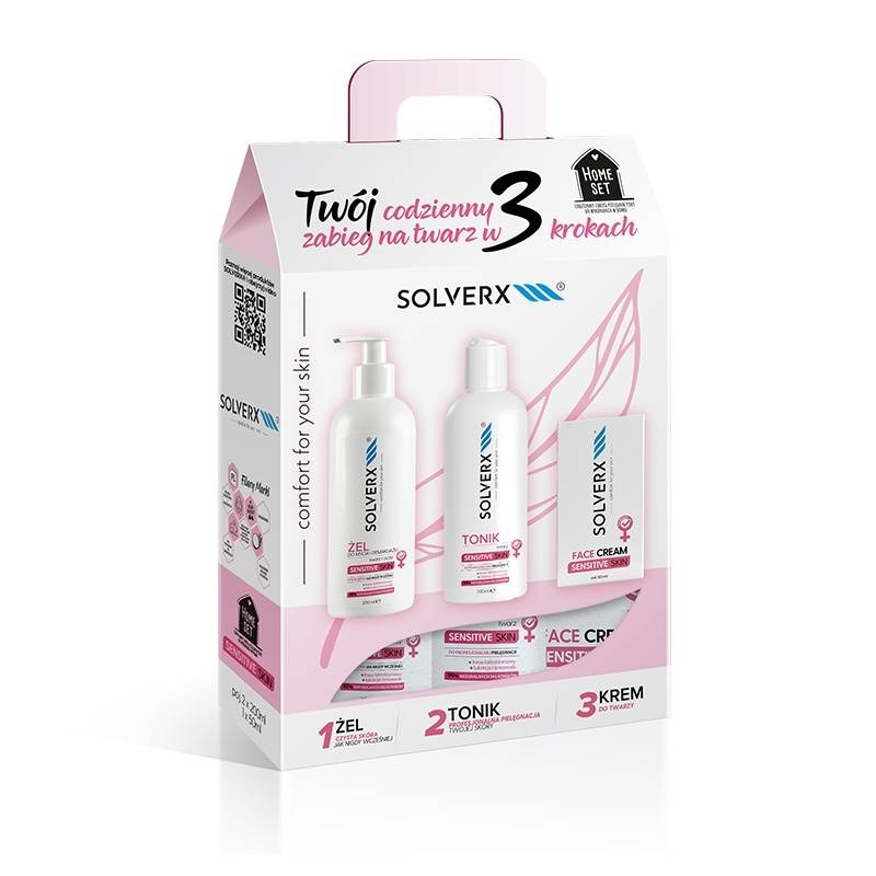 Zestaw kosmetyków do twarzy dla kobiet do skóry wrażliwej Solverx Sensitive Skin Home SET for Women. Domowy zabieg złożony z 3 komplementarnych produktów (żel, tonik, krem) dedykowanych kompleksowej pielęgnacji wrażliwej skóry twarzy.